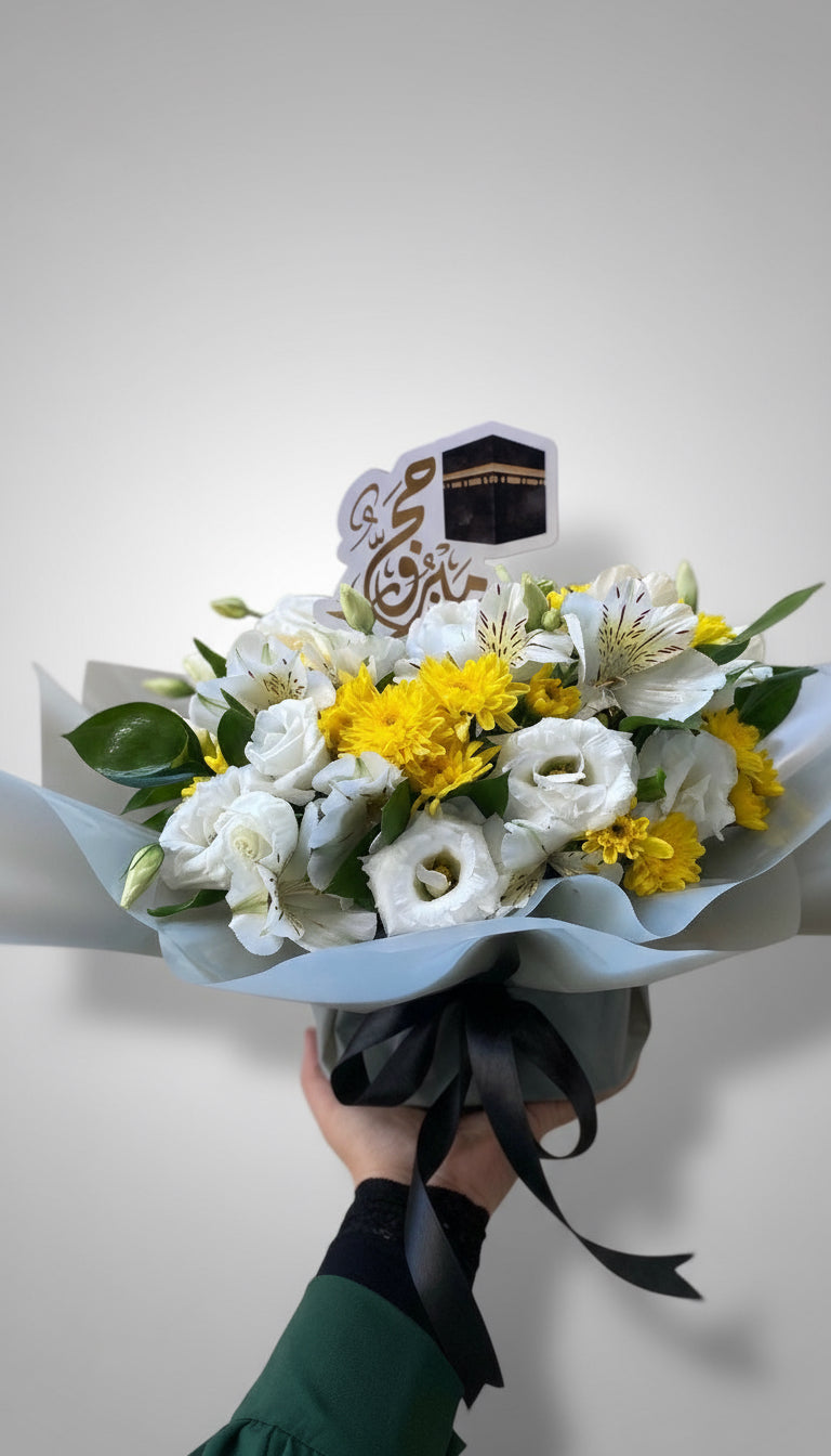 بقحة منسقة بداخلها ازهار مع تغريسة وكتابة عن الحج
